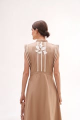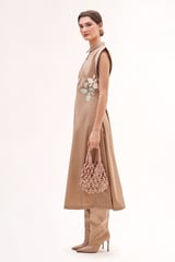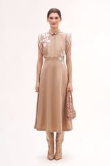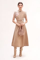 Khakhi Cotton Satin Midi Shirt Dress with Floral Appliqué
