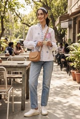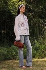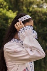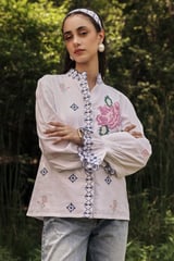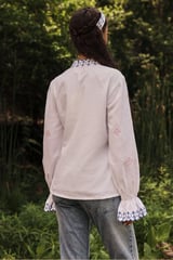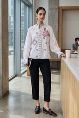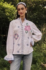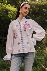 White Cotton Linen Embroidered Mandarin Collar Blouse