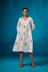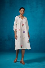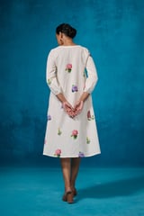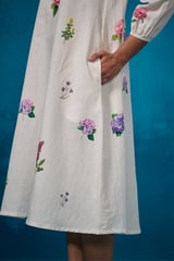 Ivory Floral Linen-Cotton A-Line Midi Dress