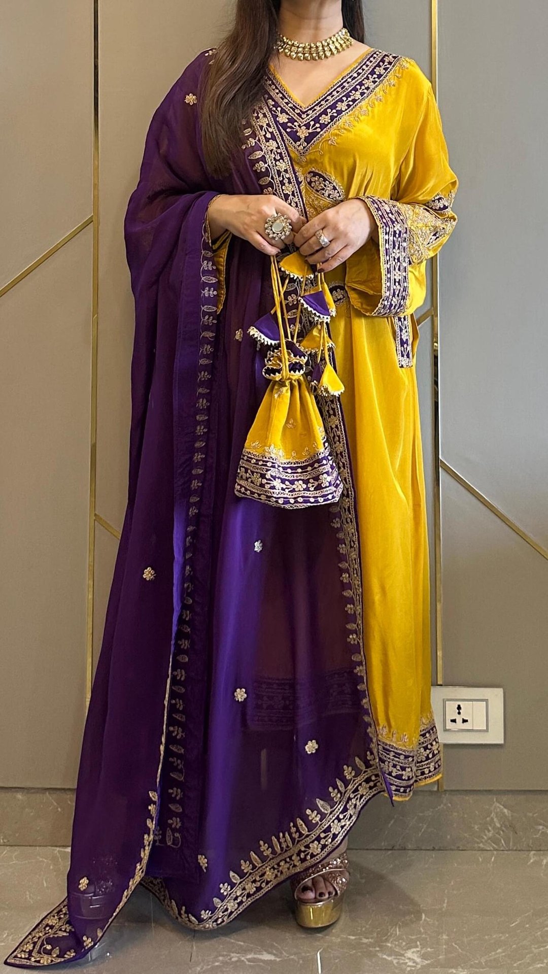 Mustard Applique Crepe Kashmiri-Phiran Kurta with Churidar and Matching Potli