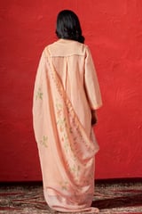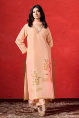 Peach Nectar Linen Straight Kurta Set with Embroidered V-Neck