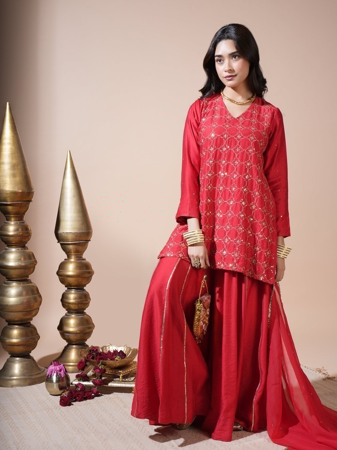 Red Geometric Jaal Short Kurta Palazzo Set