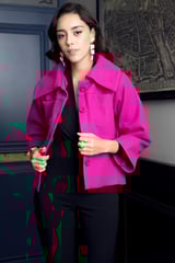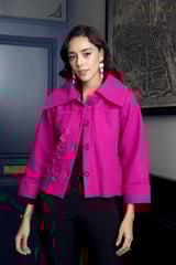 Barbiecore Pink Cropped Wool-Blend Jacket with 3D Florals