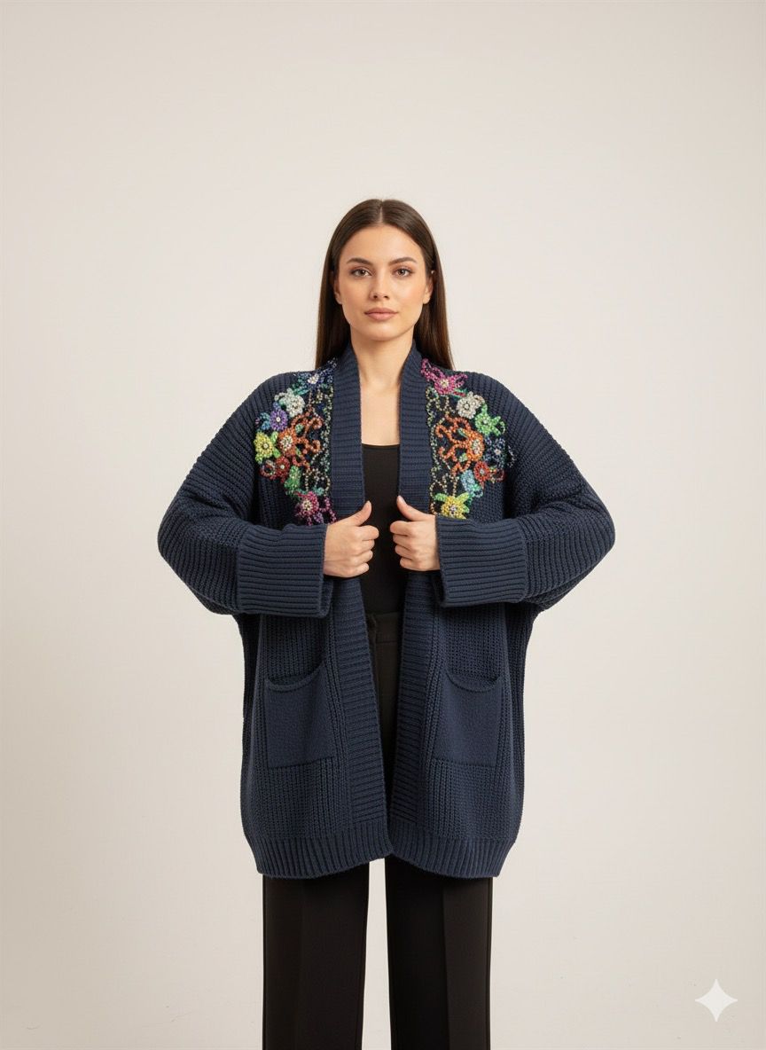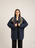 Cozy Navy Shrug with Vibrant Floral Embroidery