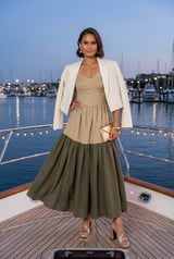 Beige Colorblocked Denim Corset Tiered Maxi Dress