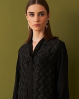 Black Pleated Texture V-Neck Mini Dress with Full Sleeves