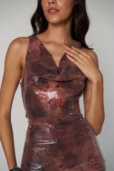 Brown Sequin Cowl Neck Open-Back Slip Midi Dress