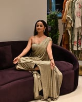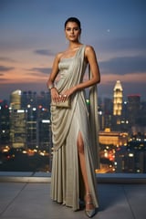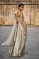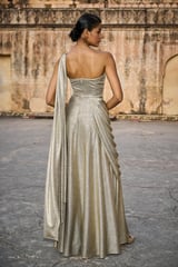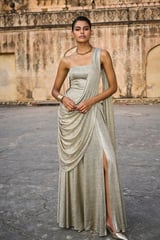 Champagne Metallic Sari Drape Maxi Gown