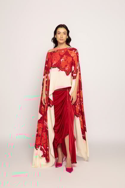 Bandhani Print Maxi Batwing Cape Maroon Ivory