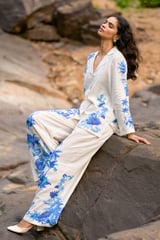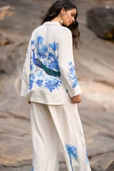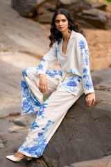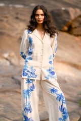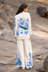 White/Blue Printed Wide-Leg Linen-Blend Trousers