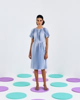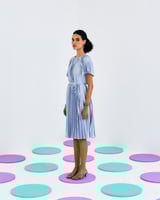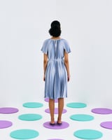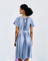 Icy Blue Pleated A-Line Midi Dress with Self-Tie Belt